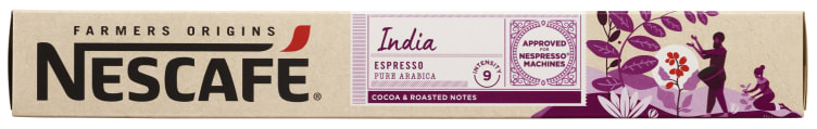 Legg en NESCAFÉ® Farmers Origins - India Espresso kaffekapsel inn i din Nespresso®-maskin. Denne enestående kaffeblandingen kommer fra noen av Indias mest erfarne jordbrukere. I Sør-Indias frodige, tropiske landskap dyrkes 100 % av kaffen i skyggen av træ