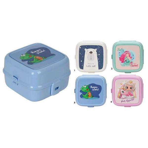 En supersøt og praktisk matboks med 4 rom og gaffel/skje.Velg mellom 4 søte motiver