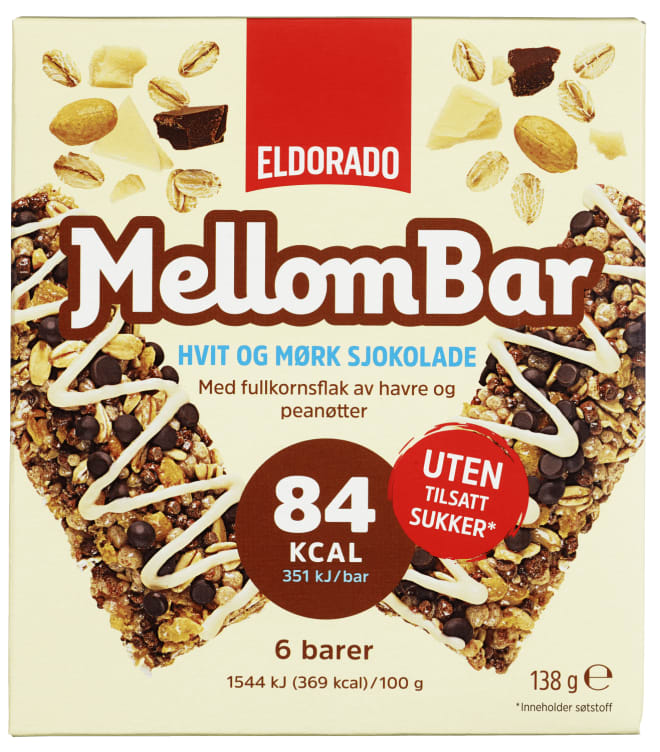 Mellommåltidsbarer med hvit og mørk sjokolade som i tillegg er sukkerfri. Under 90 kcal per bar. Passer for alle som ønsker et raskt og lett mellommåltid på farten, eller bare en liten godbit.