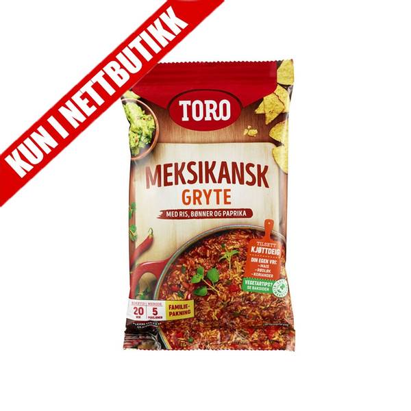 TORO Meksikansk Gryte med ris, bønner og paprika kan serveres med alle typer kjøtt, men smaker spesielt godt med kjøttdeig. Meksikansk gryte smaker godt sammen med rømme, salsa og tortillachips.284g