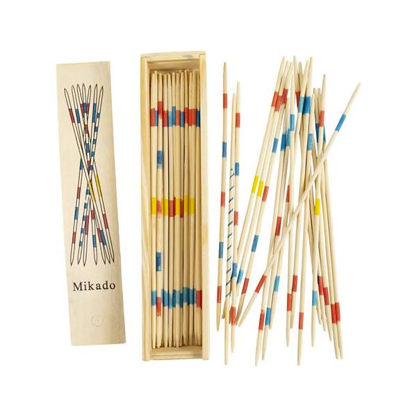 Det morsomme pinnespillet "Mikado" i en praktisk boks laget av tre.