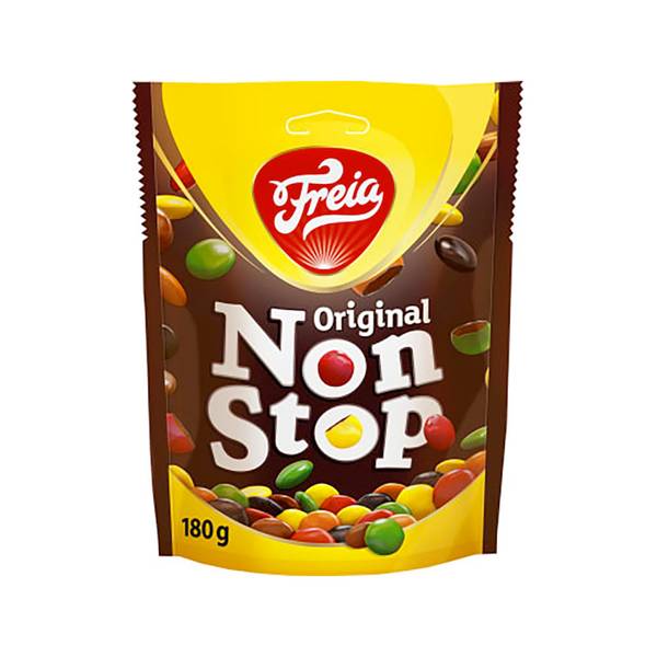 Freia Non Stop Original er fargerike linser av mørk sjokolade. Perfekt til is, kakepynt eller når du bare vil ha noe godt. 180g