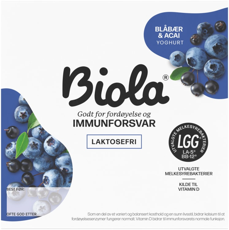 Forfriskende og god yoghurt med blåbær og acai. Inneholder aktive yoghurtbakterier, vitamin D og de nøye utvalgte melkesyrebakteriene LGG®, LA-5® og BB-12®. Denne nyheten er i tillegg beriket med fiber og vitamin C. Ett beger dekker ca. 14% av anbefalt inntak av vitamin C for voksne, og gir fiber tilsvarende en mellomgrov skive brød. Produktet er laktosefritt. Produktet er laktosefritt.