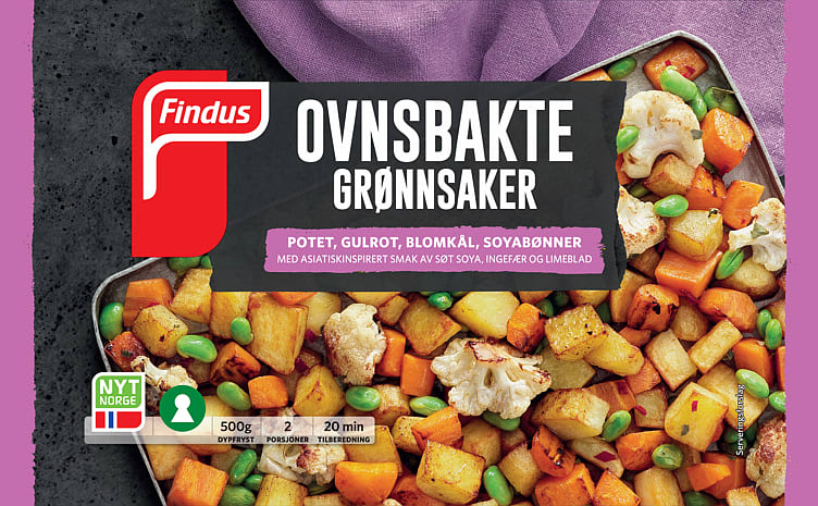 Findus Ovnsbakte Grønnsaker med soya og lime er grønnsaker på en helt ny måte. Den er rask & enkel og passer som tilbehør i allerede eksisterende middagsmeny. Ovnsbakte Grønnsaker med soya og lime er en mix potetbåter søtpotet gulrøtter aspargesbønner og kålrot smaksatt med en urteolje av fennikel sitron og hvitløk – for et perfekt resultat hver gang. Grønnsakene tilberedes raskt og enkelt i ovn eller på grillen.