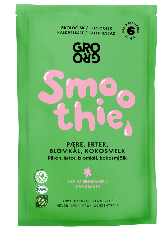 GroGro sin grønne smoothie forvandler barnas fiender (erter og blomkål) til bestevenner. Med dominant smak av pære og kokos går de næringsrike grønnsakene ned på et blunk. Dette er virkelig en grønn hverdagshelt som både stimulerer og gleder sansene! Den inneholder hele 24% grønnsaker.