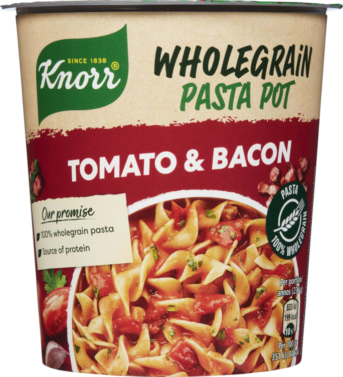 Knorr Snack Pot med tomater og bacon er en god og fyldig pastarett som passer perfekt som mellommåltid eller lunsj. Den nye Snack Pot inneholder 100 % fullkornspasta og kombinerer dermed både fiber og god smak. Snack Pot er enkel å tilberede: Hell kokende vann i koppen, rør om og sett lokket på. Maten er klar på fem minutter. Snack Pot med tomater og bacon inneholder fullkornspasta, tomater og baconbiter i en god saus. Prøv også andre Snack Pot-smaksvarianter fra Knorr!