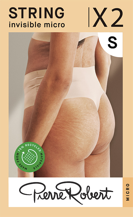 2-pack sømløs high waist stringtruse i mikrofiber. En meget flatterende passform med høyt liv og bredt midjebånd. Toveis-stretch, er laget av ultratynt mikrofibermateriale og er laserskåret for å sikre usynlige trusekanter. Sertifisert Global Recycled Standard (GRS), med 75 % resirkulert polyamid.