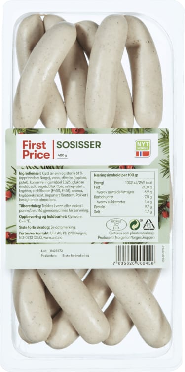 Sosisser 400g First Price er et produkt levert av UNIL AS, produktet inneholder 249.00 kcal per 100g, hvorav 20.00 g er fett, 9.70g er proteiner og 7.50 g er karbohydrater.