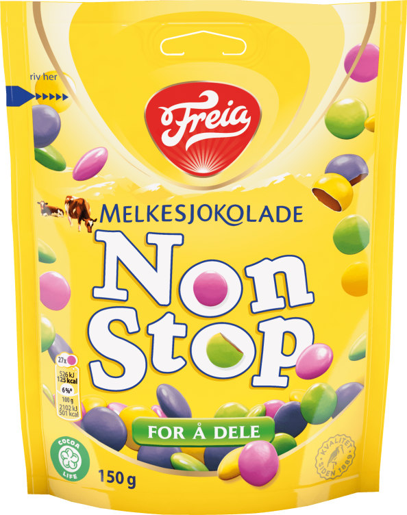 Non Stop Melkesjokolade 150g Freia er et produkt levert av MONDELEZ NORGE, produktet inneholder 501.00 kcal per 100g, hvorav 22.00 g er fett, 5.20g er proteiner og 69.00 g er karbohydrater.