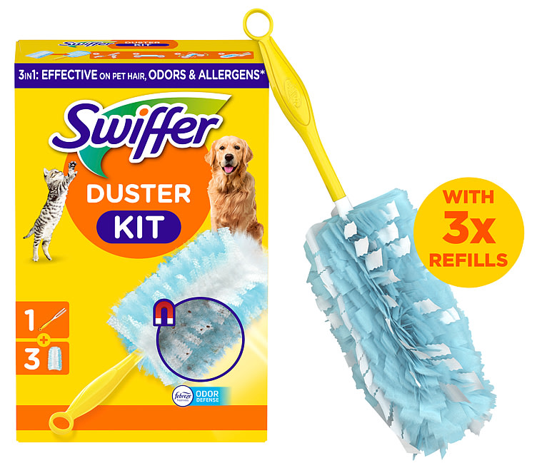 Swiffer Duster-refiller er effektive mot 100 % støv (gjelder alle typer husstøv) takket være de tusenvis av lodne fibrene som fanger opp støv smuss og hår som en magnet på alle overflater og selv på vanskelig tilgjengelige steder uten å spre det rundt i hjemmet. Fluff opp og få det rent på et øyeblikk med Swiffer Duster! Greit å vite: Egner seg spesielt godt til å samle opp dyrehår siden de fleste husdyr røyter eller hvis du har støvallergi. Den er så effektiv at du kanskje vil begynne å like å tørke støv! Swiffer Duster-refiller kan brukes med både det korte håndtaket og XXL-håndtaket.Effektiv mot 100 % støv (gjelder alle typer husstøv).Startsett: 1 Duster-håndtak +3 Duster-refiller.Fanger opp og holder på støvet som en magnet.Rengjør perfekt på vanskelig tilgjengelige steder uten å spre støvet rundt.RIST OG FLUFF OPP refillen før bruk for full Trap & Lock-funksjon.Fanger opp 3 ganger mer støv enn en vanlig støvkost.Super til å samle opp dyrehår med.Fungerer på praktisk talt alle tørre overflater uten å etterlate rester.