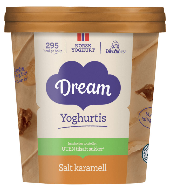Yoghurtis med smak av karamell tilsatt karamellbiter og salt karamellsaus. Dream salt karamell er uten tilsatt sukker* og har færre kalorier** uten å gå på kompromiss på smaken. Et lett valg. *Yoghurtisen inneholder søtstoffer og har et naturlig innhold av melkesukker**Sammenlignet med annen is.