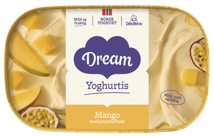 En deilig ny yoghurtis i Dream serien med fruktig smak av mango tilsatt mango – og pasjonsfruktsaus. Dream serien relanseres med de beste råvarene i nytt design og med enda mer norsk yoghurt. Med 50% mindre fett sammenlignet med tilsvarende produkter* er den mild myk og luftig. Passer perfekt til servering!*Sammenlignet med annen is.