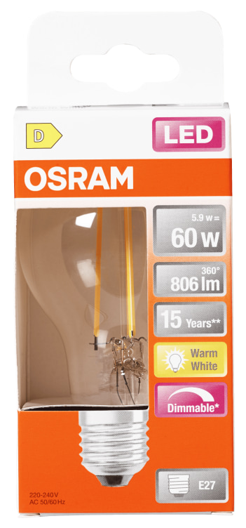 Lyspære Led Cl A 60 Klar Dim 827 E27 Osram