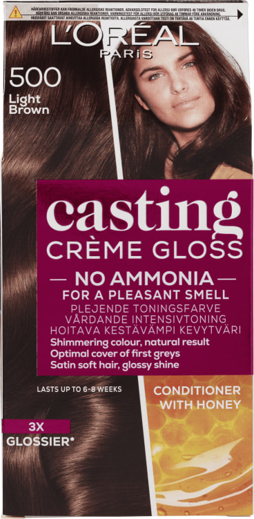 Casting Crème Gloss passer perfekt for deg som vil forsterke din naturlige hårfarge med reflekser, og gi håret ditt ny glans. En pleiende toning som holder i 6-8 uker. • Gir glød til den naturlige hårfargen din. • Naturlig glansfull farge med synlige reflekser. • Pleiende, helt uten ammoniakk. • Lysner ufarget hår 1 tone. • Dekker grått hår opptil 70 %. • Pleiende toning som varer ca. 6-8 uker. For ekstra pleie til farget hår