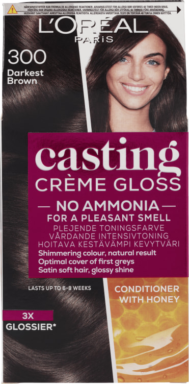 Casting Crème Gloss passer perfekt for deg som vil forsterke din naturlige hårfarge med reflekser, og gi håret ditt ny glans. En pleiende toning som holder i 6-8 uker. • Gir glød til den naturlige hårfargen din. • Naturlig glansfull farge med synlige reflekser. • Pleiende, helt uten ammoniakk. • Lysner ufarget hår 1 tone. • Dekker grått hår opptil 70 %. • Pleiende toning som varer ca. 6-8 uker. For ekstra pleie til farget hår