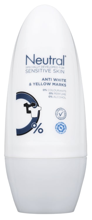 Neutral Antiperspirant Anti White & Yellow Marks Roll-On er en mild antiperspirant som holder deg frisk og i kontroll hele dagen. Den er spesielt utviklet for å beskytte deg mot svette og hvite flekker eller gule merker på klærne. Den milde formelen er skånsom mot sensitiv hud og fri for alkohol, parfyme og andre unødvendige tilsetningsstoffer som kan irritere huden. Nøytral Anti-perspirant Anti White & Yellow Marks Roll-On er egnet for daglig bruk, dermatologisk testet, AllergyCertified og anbefalt av Asthma Allergy Nordic. Vi gjør det enkelt å ta vare på hele familiens hud ved å tilby skånsomme, skånsomme produkter som bidrar til å beskytte huden din mot allergi – fra tørr og fet hud, til sensitiv hud, til babyhud og hud som lett utvikler eksem. I tillegg til hudkrem inneholder Neutral-serien også hudvennlige produkter for personlig pleie, som f.eks dusjsåpe, sjampo og håndsåpe i tillegg til produkter til barn og babyer som f.eks badesåpe og babyolje. Med produkter fra vaskemiddel til kremer – og alt i mellom – hjelper Neutral deg med å skape lettere og mildere hudpleie hver dag. Les mer om Neutral på Neutral.com