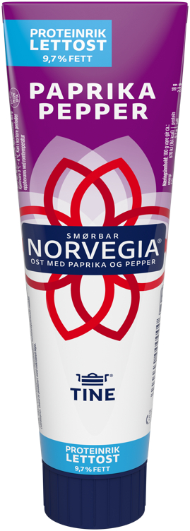 Norvegia Smøreost Paprika/Pepper Lett 165g Tine er et produkt levert av TINE SA og produktet inneholder 161.00 kcal per 100g, hvorav 9.70 g er fett, 18.00g er proteiner og 0.30 g er karbohydrater.