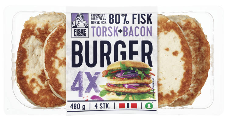 4 stk fiskeburgere av 80% fisk (torsk og hyse) og med smak av bacon.