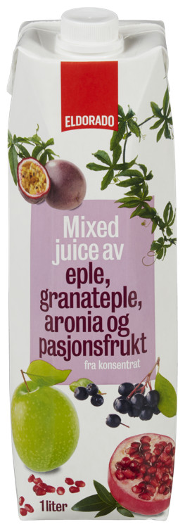 Eplejuice 78 %, Granateplejuice 15 % og Aroniajuice 6 % Og Pasjonsfruktjuice 1 %.