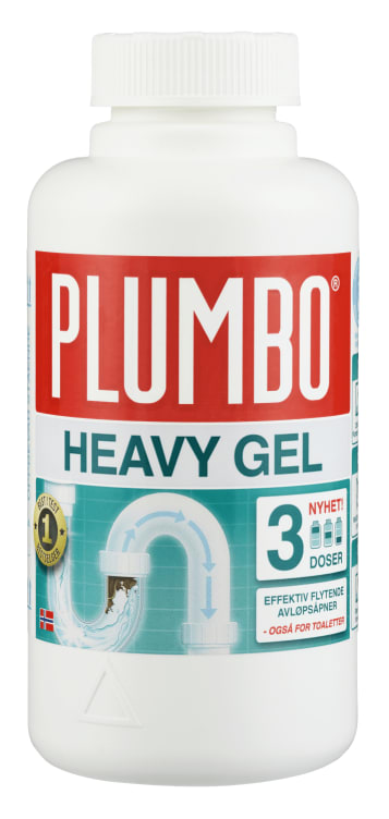 Nye Plumbo Heavy Gel gir 3 doseringer pr flaske, og kan også brukes i toalettet. Heavy Gel er tyngre enn vann, og har en gelkonsistens som gjør at den konsentrert trenger gjennom vann, og løser propper av hår, matrester, såpe og fett. Den unike blandingen gir en råsterk avløpsåpner som jobber raskt