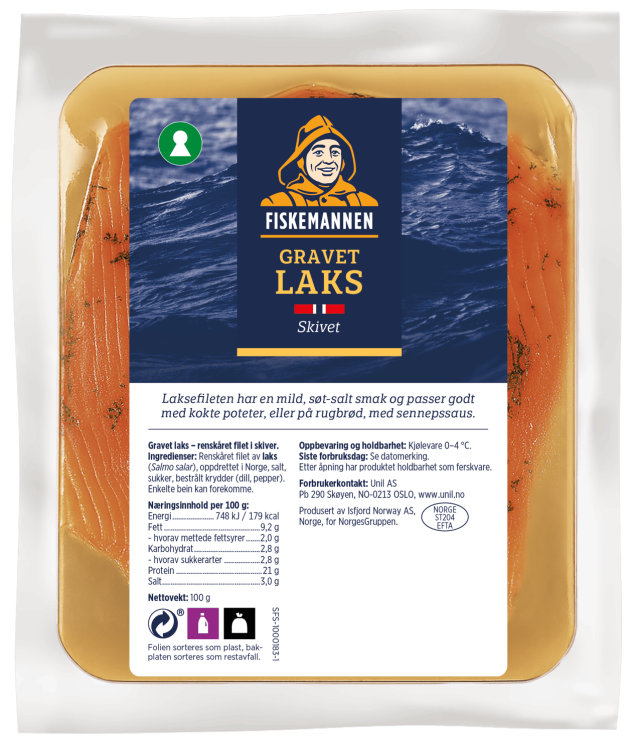 Laks Gravet i skiver 100g Fiskemannen er et produkt levert av Unil og produktet inneholder 179.00 kcal per 100g, hvorav 9.20 g er fett, 21.20g er proteiner og 2.80 g er karbohydrater.