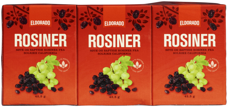 Rosiner 6x42g Eldorado er et produkt levert av Unil og produktet inneholder 335.00 kcal per 100g, hvorav 0.20 g er fett, 3.20g er proteiner og 77.80 g er karbohydrater.